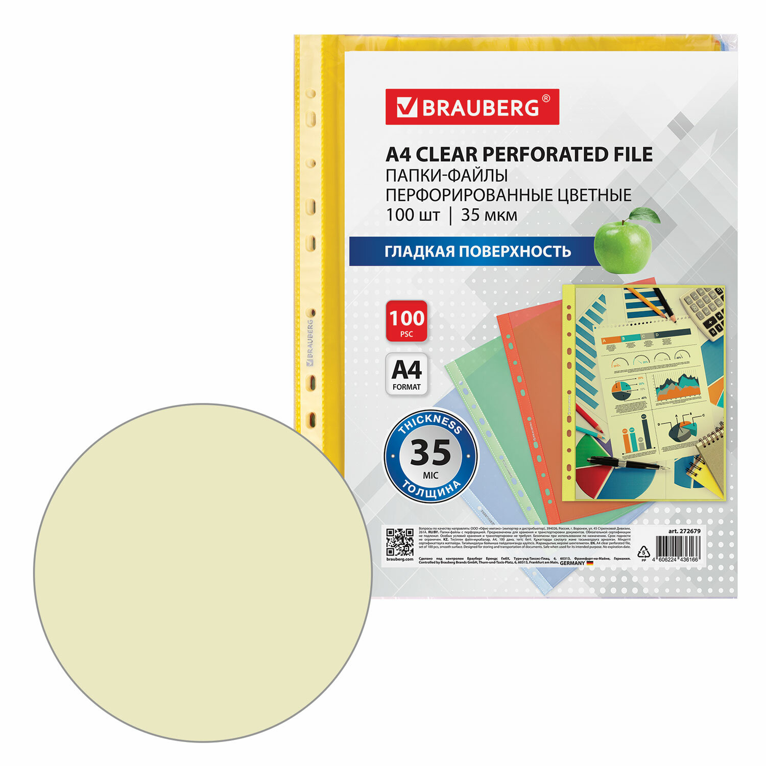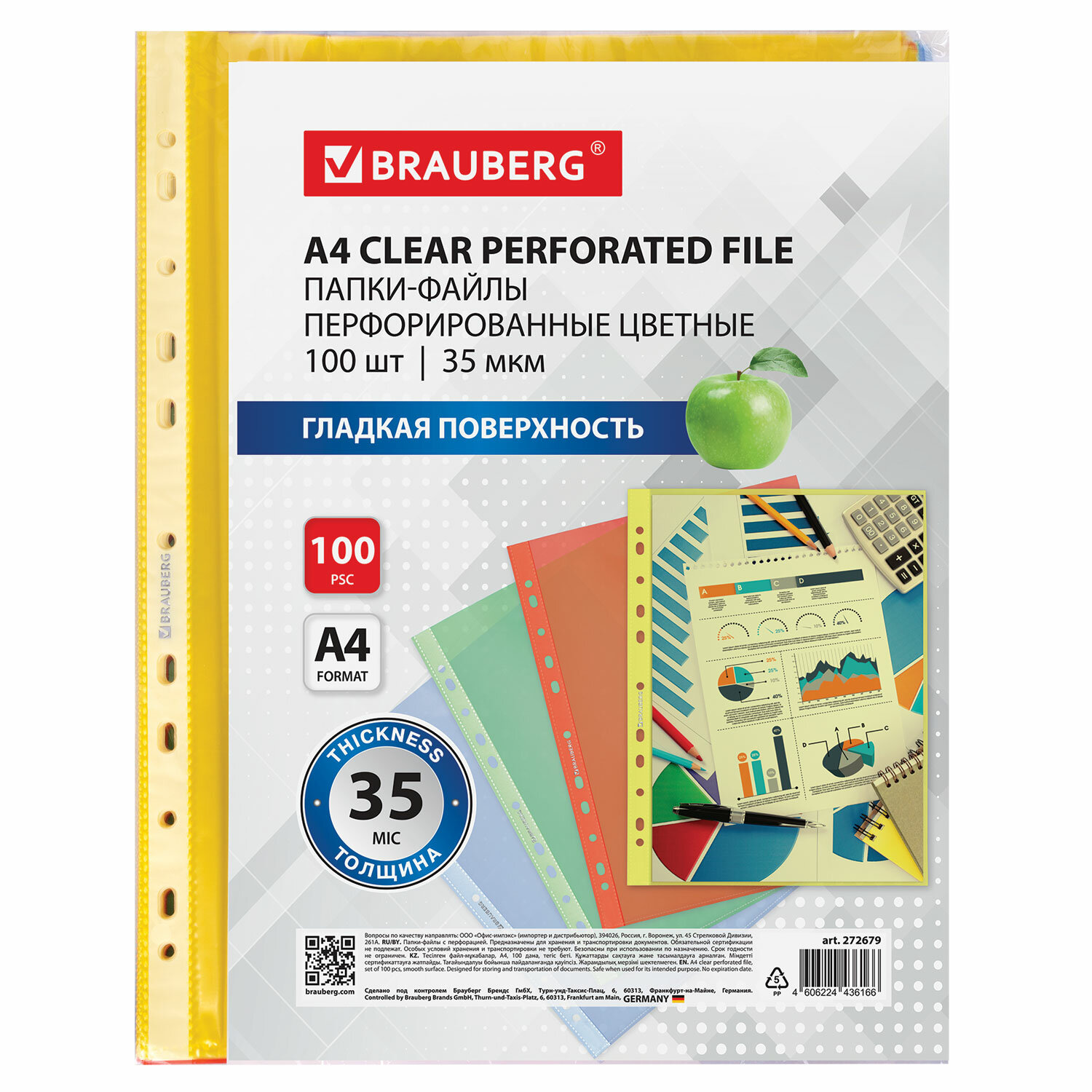 Папки-файлы формата А4 с вертикальной ориентацией имеют универсальную перфорацию и отличаются цветной поверхностью, что упрощает систематизацию документов по цветам. Яркие и практичные перфопапки идеально подходят для хранения бумаг, помогают упорядочить документы и надежно защищают их в течение длительного срока. Файлы изготовлены из прочной пленки толщиной 35 мкм. В упаковке 100 перфопапок, 4 цвета: желтый, красный, синий, зеленый.